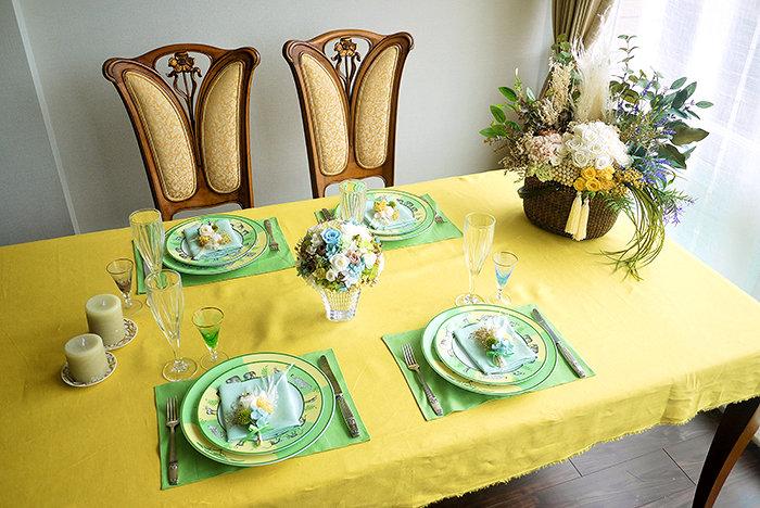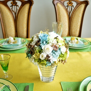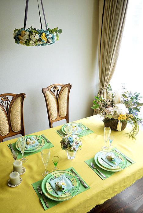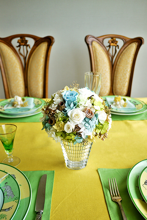 動物柄に元気がもらえるエルメスのアフリカプレートに合わせ、バカラベースにホワイトグリーンで爽やかに、楽しい会話を想像しながら制作しました。