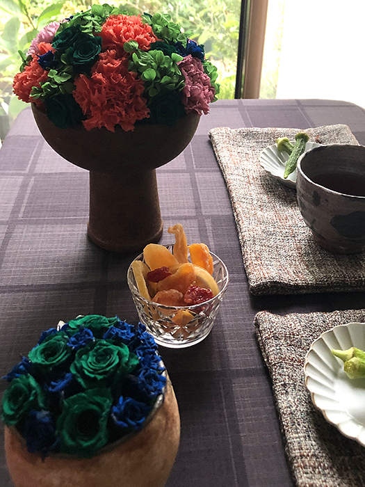 息子達も独立し、今は夫と二人生活。明るい花と好きな器でのんびり過ごすお茶の時間。