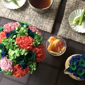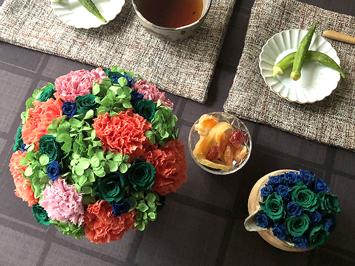 毎回変わるテーマは花の枠にとどまらず、プリザーブドフラワーの可能性を常に探求しています。