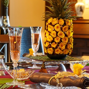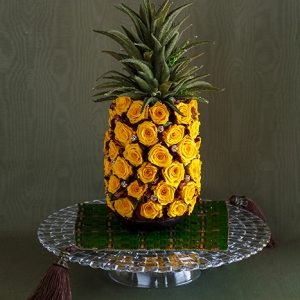 ベイビーローズ(ゴールデンイエロー)、スタンダードカーネーション(カフェ等)、トロピカルパピルス、ラウンドスパークルゴールド
