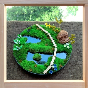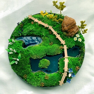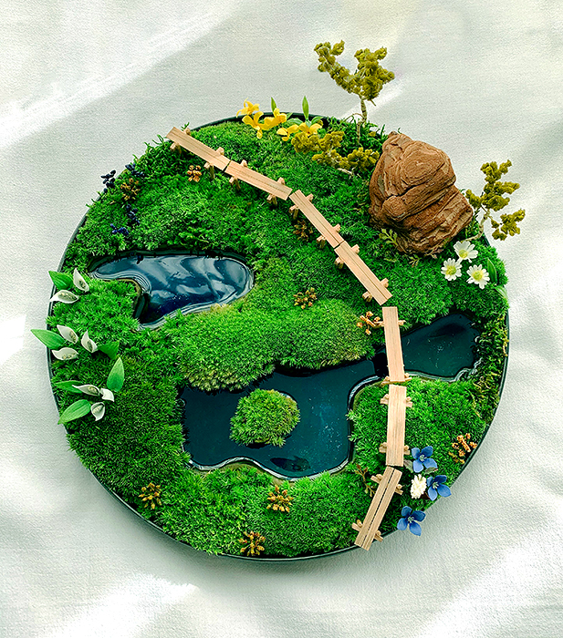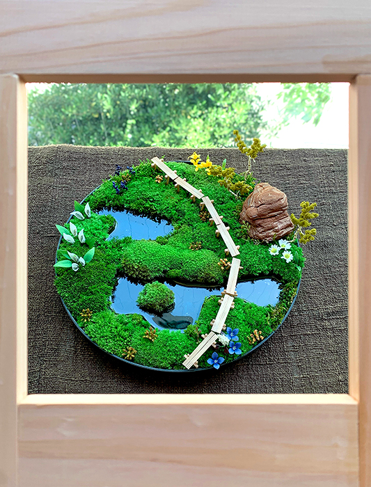 ジオラマ風の尾瀬。池塘は粘土で制作し深山を映す深緑に彩色しました。水芭蕉の苞も粘土です。尾瀬を夢見て昨年逝去した友に捧ぐ。