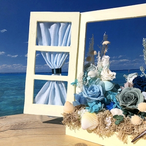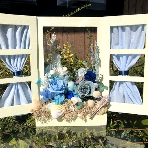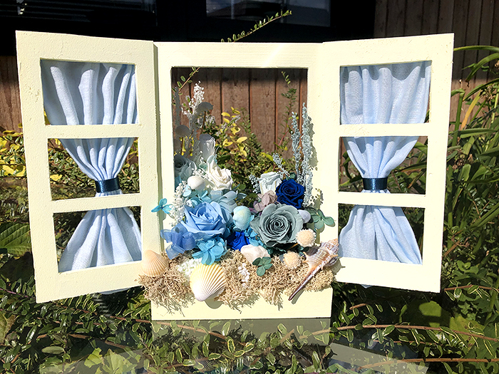 毎回変わるテーマは花の枠にとどまらず、プリザーブドフラワーの可能性を常に探求しています。