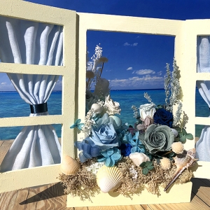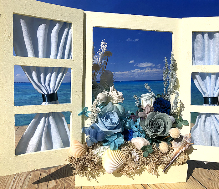 全体をブルー系で涼しげにまとめて爽やかに。貝殻を散りばめて海の中を表現しました。