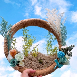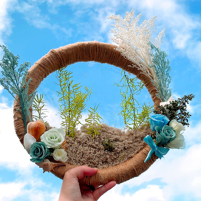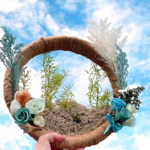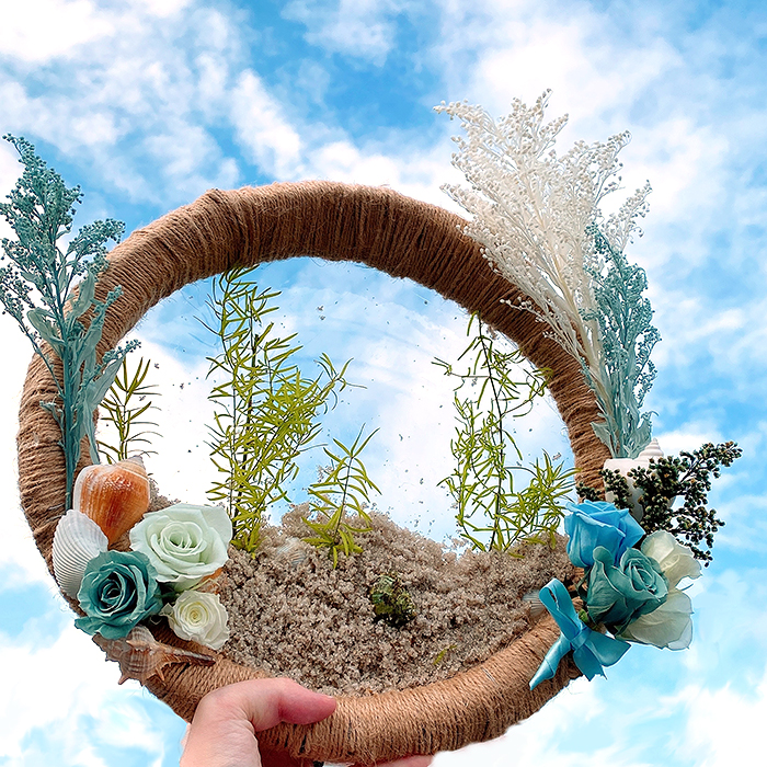 枝を輪状にし麻紐で巻き、裏面にプラスチック板を貼りその上に砂と貝殻、アスパラを使い海中をイメージしました。最後に青空を撮影しました。