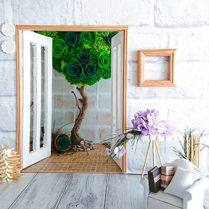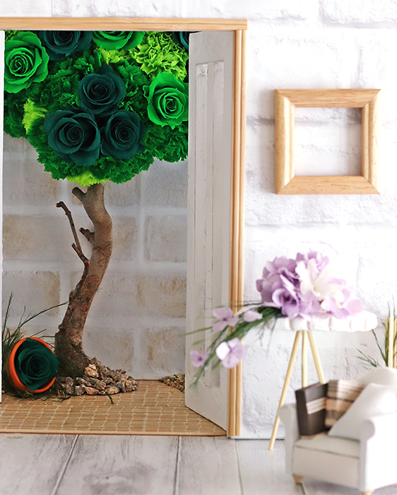 毎回変わるテーマは花の枠にとどまらず、プリザーブドフラワーの可能性を常に探求しています。