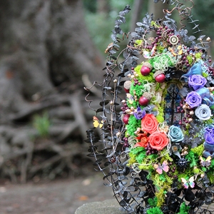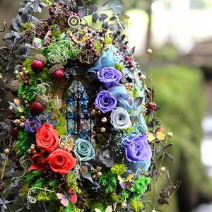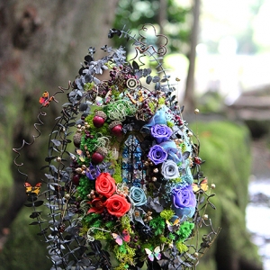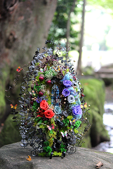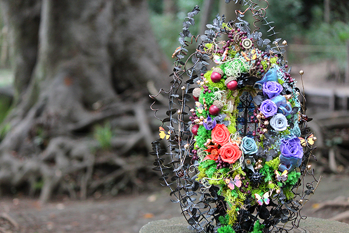 毎回変わるテーマは花の枠にとどまらず、プリザーブドフラワーの可能性を常に探求しています。