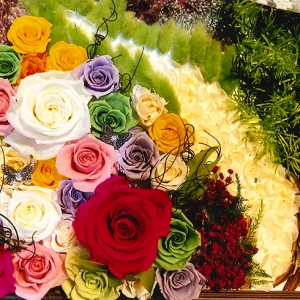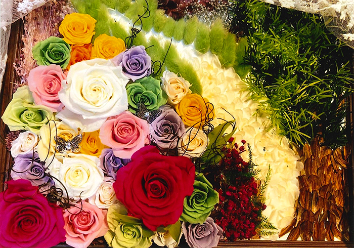 毎回変わるテーマは花の枠にとどまらず、プリザーブドフラワーの可能性を常に探求しています。