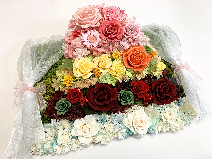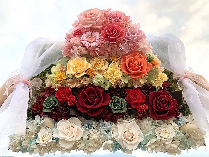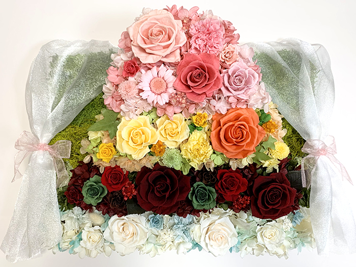 毎回変わるテーマは花の枠にとどまらず、プリザーブドフラワーの可能性を常に探求しています。