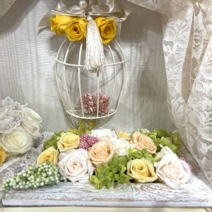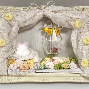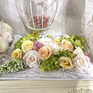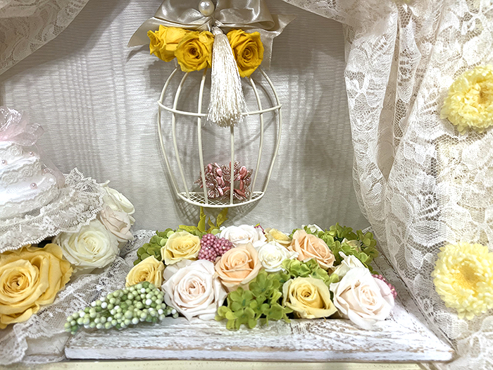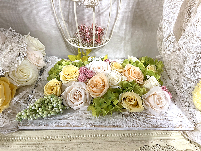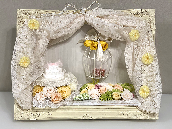 毎回変わるテーマは花の枠にとどまらず、プリザーブドフラワーの可能性を常に探求しています。