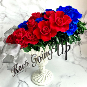 高みを目指し、右肩上りに成長し続ける様を表現しました。小さな赤バラが大きな青バラへと変化していく様子に隠された第二メッセージもお楽しみ下さい!
