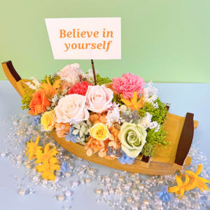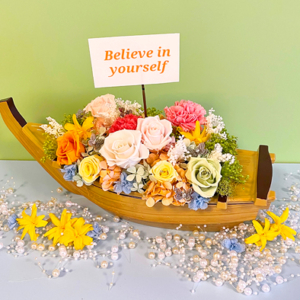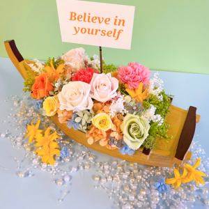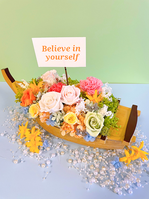 毎回変わるテーマは花の枠にとどまらず、プリザーブドフラワーの可能性を常に探求しています。