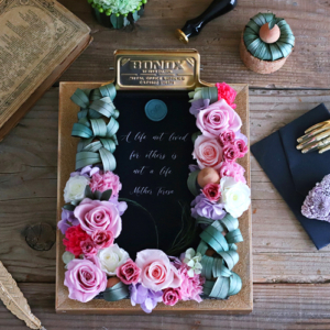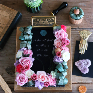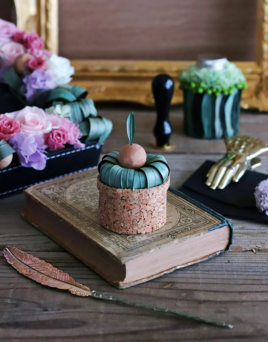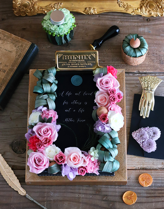 毎回変わるテーマは花の枠にとどまらず、プリザーブドフラワーの可能性を常に探求しています。