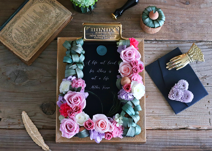マザーテレサの名言で「他者のために生きない人生は人生ではない」素敵な言葉を花で装飾していつも見ていたいと思いました。