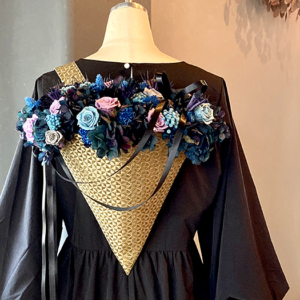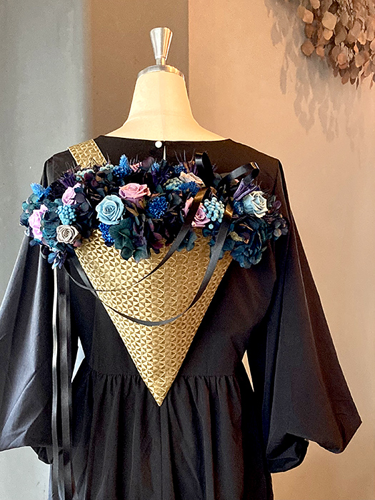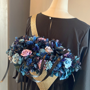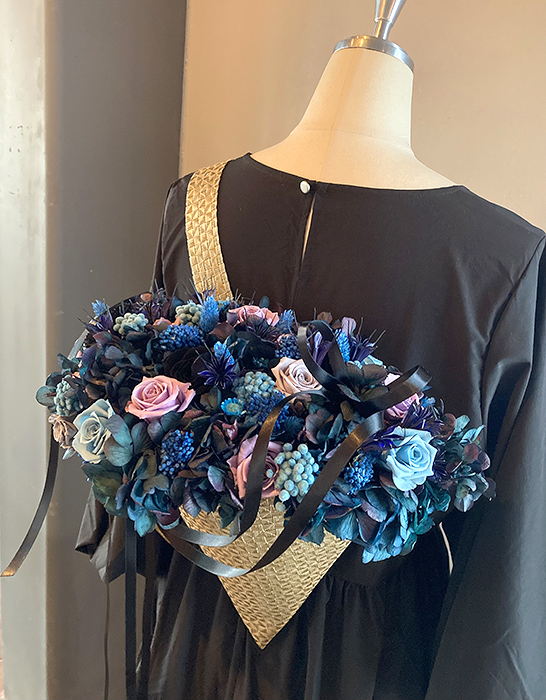 後ろ姿をお花とリボンで美しく飾ります。人が動くとそれは揺れ動き、周りの人達をも楽しませることでしょう。