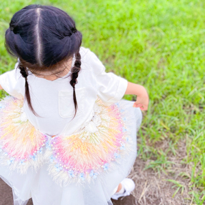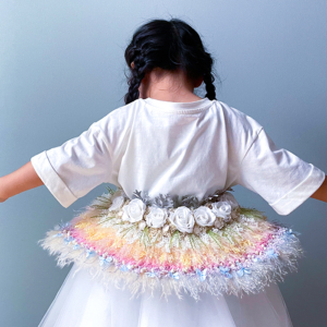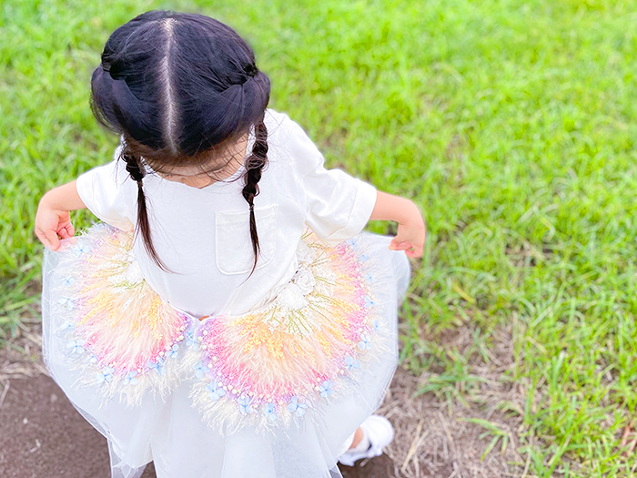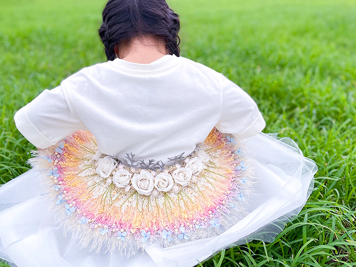 刺繍をするように花を生地に縫い付けました。細かい部分は接着剤を使い分けて接着しました。七五三を迎える娘が強い生命力を持つ花のように、健やかに成長することを願ってこの形にしました。