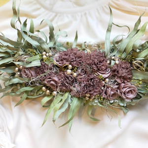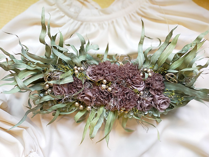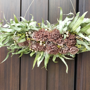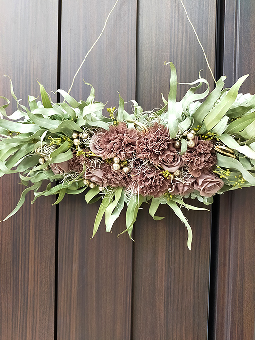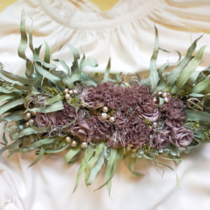 カーネーション(ブラウングレー)、スプレーローズ(ブラウングレー)、ユーカリニッコリーベリー、ゴアナクロウ(プラチナ)