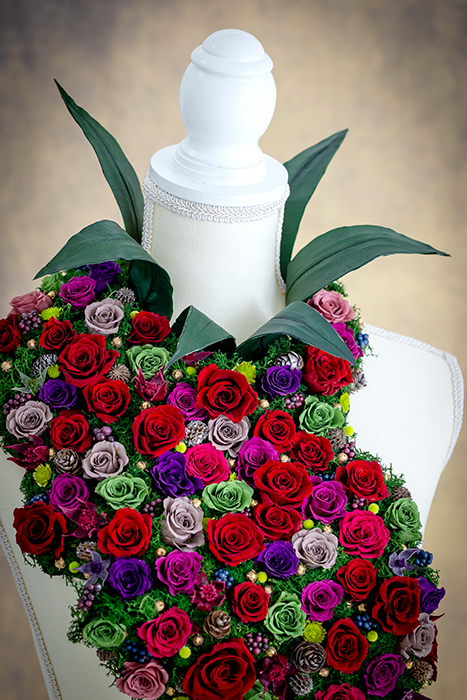 毎回変わるテーマは花の枠にとどまらず、プリザーブドフラワーの新しい可能性を常に探求しています。