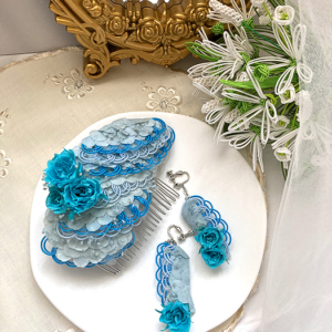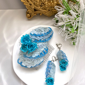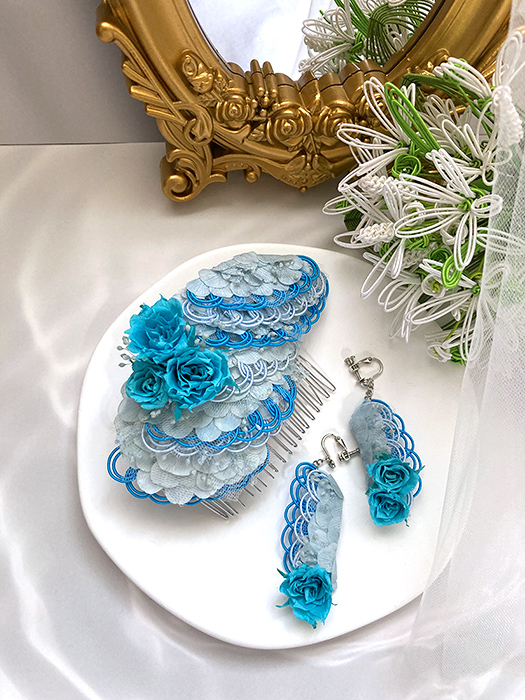 青空に羽ばたく翼をイメージした髪飾りとイヤリング。水引のあわじ結びを用いた土台には、永遠に幸せが続くよう願いを込めて。