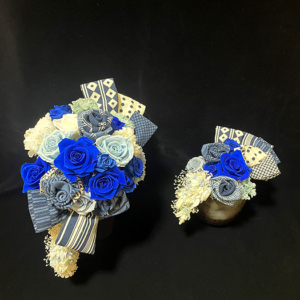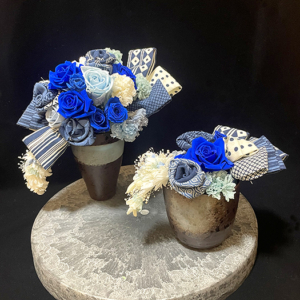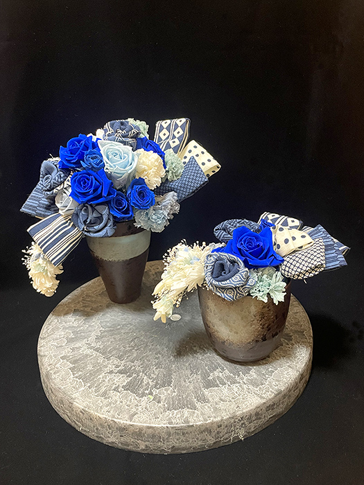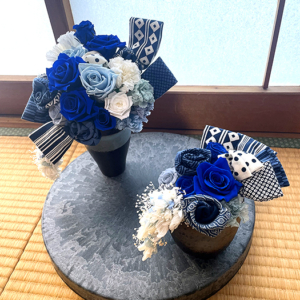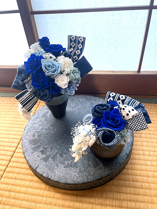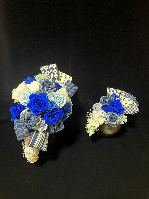輪ギク(パールホワイト)、スプレーローズ(グランブルー)、ミックスパレット(ブルーミックス)、スタンダードカーネーション 等
