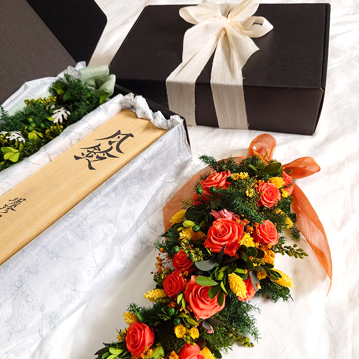 スプレーローズ、ピッコラブロッサムローズ、カスミソウ、ブルーム、ヘデラ アルボレア、ツゲ、ミンファーン、ファラリス ドライ