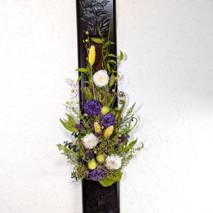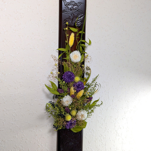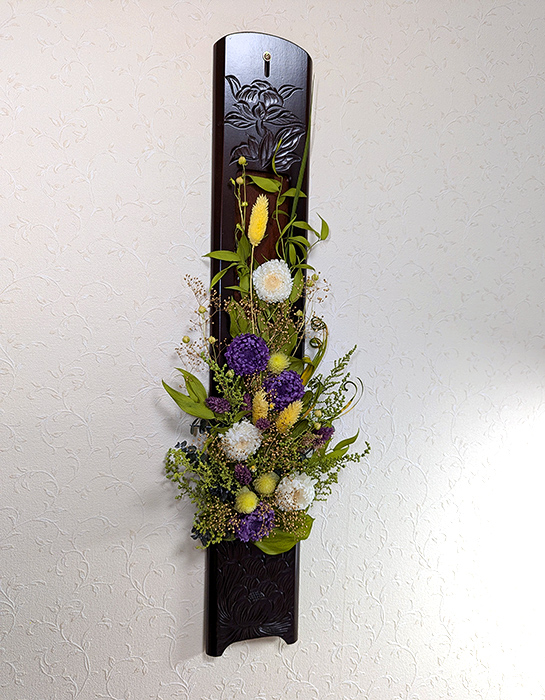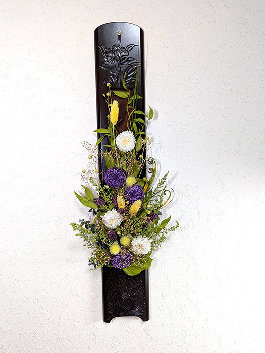 生前義母から「お土産よ」と貰った日光彫の短冊掛に、秋色の草や花を挿しました。