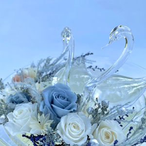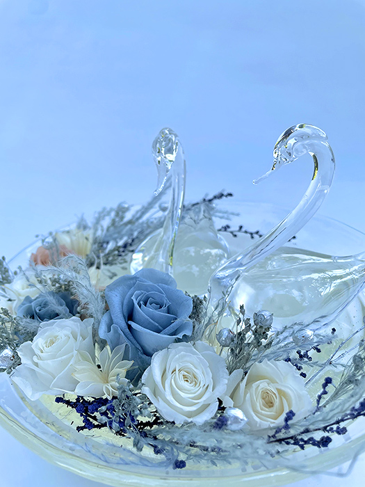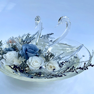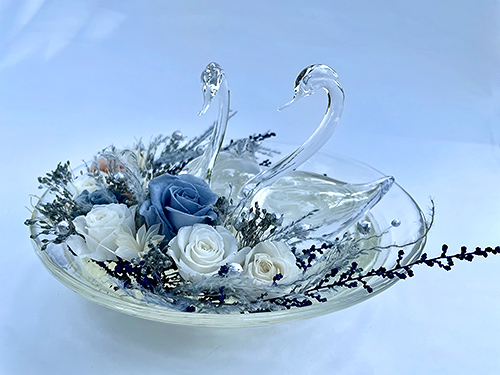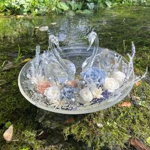 安曇野の冬の訪れを知らせるコハクチョウの飛来。ガラスのプレートに水辺をイメージしたアレンジです。