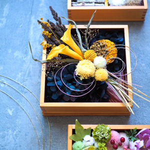 アナスタシア(シトラスグリーン)、ポンポンマム デュオ (ホワイト×グリーン)、ポンポンマム デュオ (ホワイト×ピンク) 、ポンポンマム(イエロー、ベイビーピンク、シトラスグリーン)、アスター(イエロー) 、アキレア ドライ (ナチュラル)、アマレリーノ ドライ(ナチュラル)、グリクシア ドライ