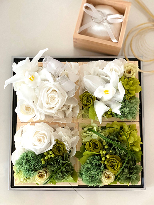 毎回変わるテーマは花の枠にとどまらず、プリザーブドフラワーの可能性を常に探求しています。