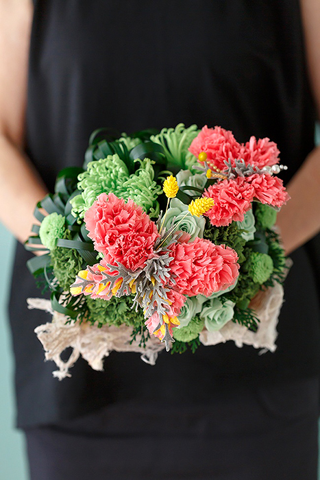 毎回変わるテーマは花の枠にとどまらず、プリザーブドフラワーの可能性を常に探求しています。
