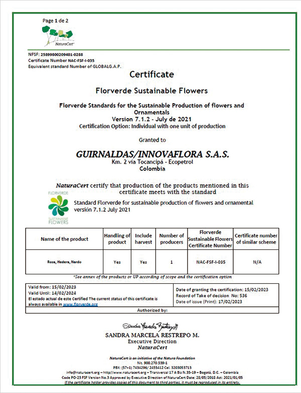 フロールエバーが生産するローズなどの花材がコロンビア花卉輸出協会よりFlorverde Sustainable Flowers(FSF)認証を獲得しました。