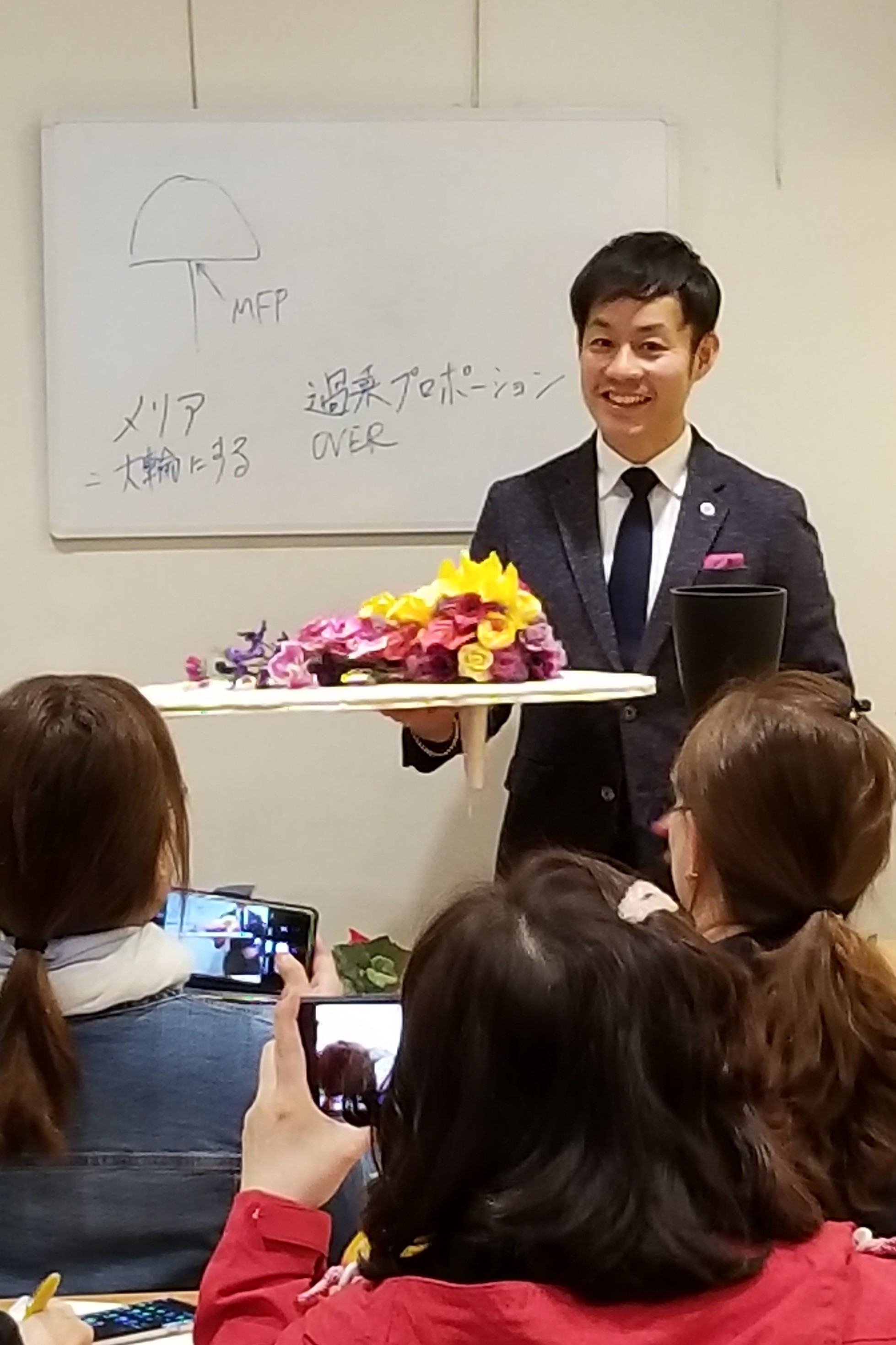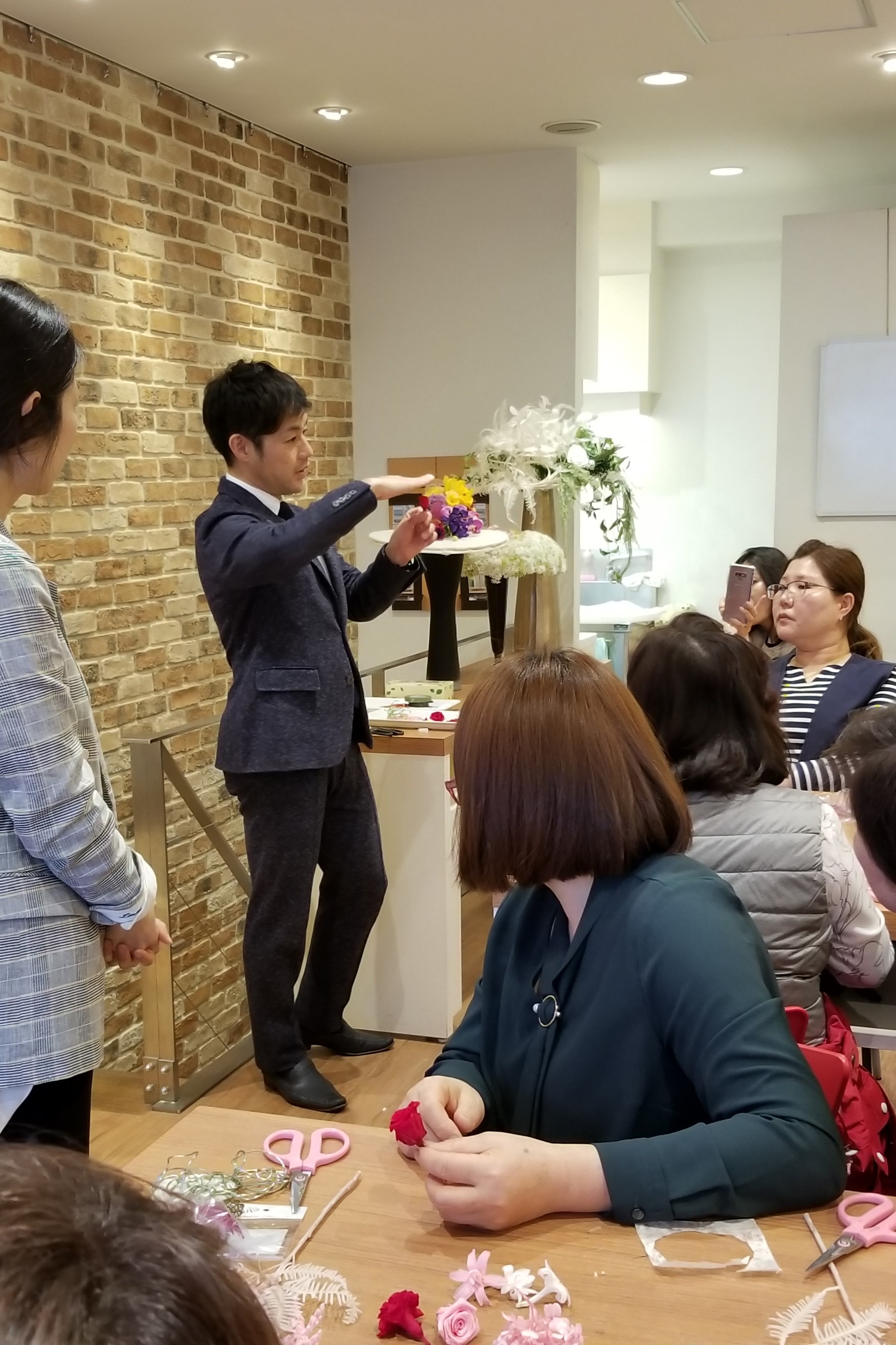 【International Seminar】 2019/04/22 イベントレポート International 4月10日、韓国のPreserved KOREAの皆様がセミナーを受講されました。 講師はフラワーデザイナー今野亮平氏(株式会社ベル・フルール代表取締役社長)です。 午前中はウエディングブーケのデモンストレーションです。 スタイルの違う4種類のブーケをそれぞれロジックを織り交ぜながら、丁寧に作り上げます。 午前中の講義を踏まえ、午後は皆さんにウェディングやパーティーに応用できる作品を作っていただきました。 ご参加いただいた皆さま、今野先生、ありがとうございました。