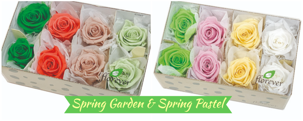 | メディアナローズ カラーパレット (スプリングガーデン) FL0301-120 ¥4,880 (¥610/輪) ■ 1箱(8輪)/48箱 ■ 4色(ヌードピンクx2輪、シトラスグリーンx2輪、 フラミンゴオレンジx2輪、グラスグリーンx2輪) |
