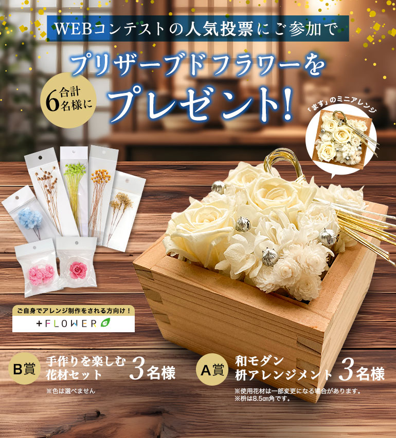 「和モダン枡アレンジメント」または「手作りを楽しむ花材セット」をプレゼントいたします。