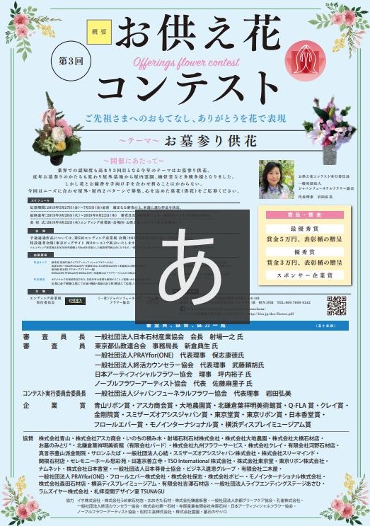 フロールエバーも第1回よりご協力させていただいている、お供え花コンテスト。現在作品募集中です。(締め切りは7月5日(金)必着)