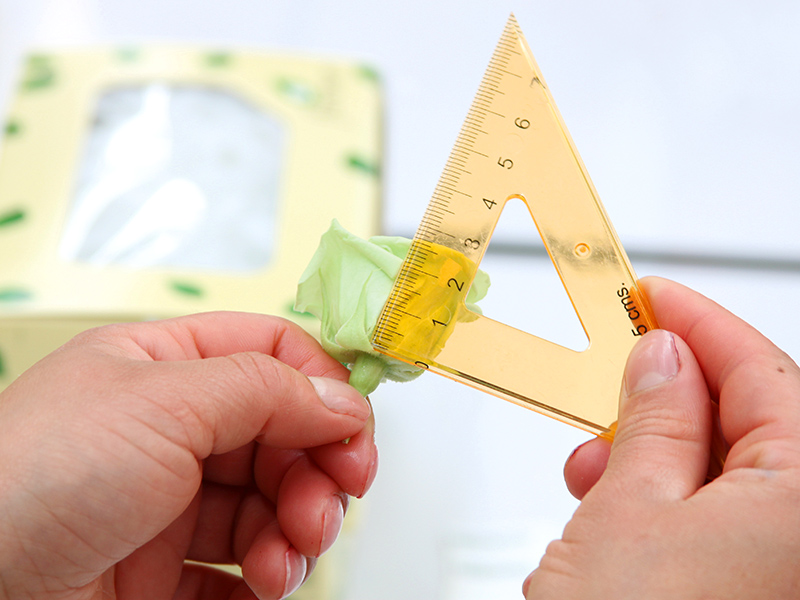 加工が完了した花は、再度、決められた品質の条件を満たしているかを一輪ずつ検査し、サイズについては定規で大きさが規格に収まっていることを確認してから箱詰めします。
