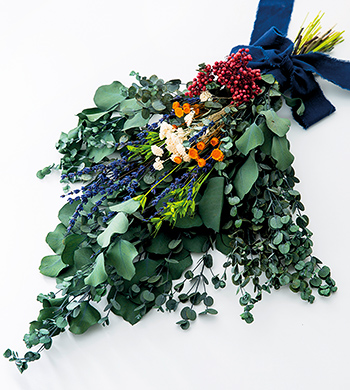 刻々と表情を変える水のように、様々なブルーを合わせて「青の世界」を表現します。水面のきらめきを思わせるガラスや金属など、光るものを加えたり、赤、ピンク、オレンジなど反対色をアクセントとして少量加えると、よりブルーが引き立ちます。