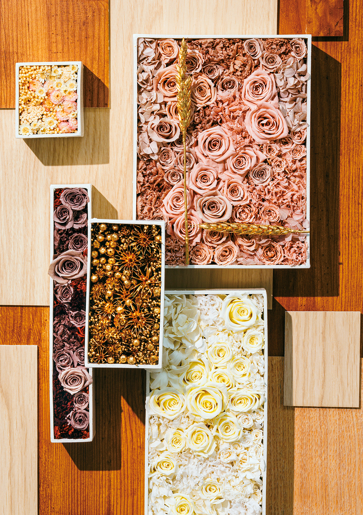 温かみのあるホワイト、穏やかなピンク、ベージュ、ブラウンを、ローコントラストに色数を絞って配色します。